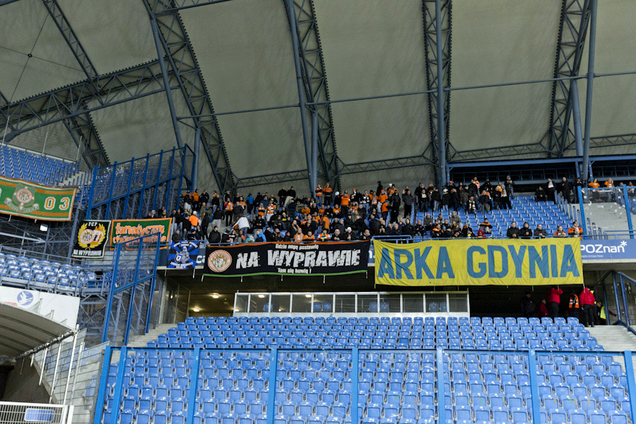 Jak to zwykle podczas wyjazdów do Poznania bywa, większość z nas na wyprawę wybrała się autami. Z Lubina wyruszył także jeden autokar. Droga jak zwykle krótka, szybka i bezproblemowa. Wejście dość sprawne, choć to na stadionie Lecha nie powinno dziwić. Na sektorze meldujemy się przed rozpoczęciem meczu w sile – uwaga – 220 osób, w tym około 20 osób z Zawiszy oraz 10 z Arki. Dlaczego uwaga? Dlatego, że jak na wyjazd do Poznania, w sobotę o godzinie 20:30 liczba ta jest po prostu tragiczna. Można usprawiedliwiać się słabymi wynikami, kolejnym wyjazdem do Poznania w tym roku, sporą liczbą wyjazdów w tej rundzie, złą pogodą, ale… co to za tłumaczenie? Równie dobrze można tłumaczyć się imieninami chłopaka kuzynki wnuczki ciotki szwagra. Jedynym plusem może być to, że na sektorze widoczne były te same twarze co zawsze, zgrana ekipa, na którą zawsze można liczyć. Jeśli chodzi o liczbę fanatycznych chojnowian, to wyniosła ona 28 osób, co jest wynikiem mocno średnim. Stać nas na dużo więcej.