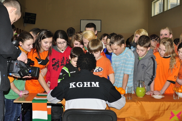Spotkanie zorganizowane zostało w sali gimnastycznej, którą przyozdobiliśmy w nasze barwy. Costa chętnie odpowiadał na pytania uczniów Gimnazjum nr 1. oraz Szkoły Podstawowej nr 3. Potem przyszedł czas na konkurs - aby wygrać karnety, szaliki, piłki wystarczyło poprawnie odpowiadać na pytania oraz celnie rzucać do kosza. W międzyczasie chojnowska młodzież mogła podejść do Costy, poprosić o autograf, zadać kilka pytań czy zrobić sobie pamiątkowe zdjęcie.