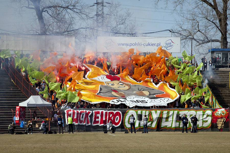 Zbiórka na pociąg została zaplanowana na stacji Lubin Górniczy w sobotę o godzinie 4:20, wyjazd nastąpił godzinę później. Pierwszy przystanek jaki zaliczyliśmy miał miejsce w Legnicy, która nieco brutalnie została wybudzona przez nas pirotechniką około 6 rano, na pamiątkę po sobie zostawiliśmy drobny ślad. Ciekawe, czy i tym razem znajdzie swój finał w telewizji, wszak farba na zamalowanie może chłopaków nieco kosztować. Na dworcu Łódź Kaliska leżącym ledwie kilkaset metrów od stadionu ŁKS meldujemy się blisko 2 godziny przed pierwszym gwizdkiem spotkania, mieliśmy zatem bardzo dużo czasu, by wszyscy wejść na czas na stadion. Jak się okazało, samo wchodzenie było bardzo powolne, a ostatnie osoby stawiają nogę na sektorze tuż przed samym rozpoczęciem meczu... Bardzo dobrze oflagowaliśmy sektor, zawisły tym razem: Na wyprawie, OCB03, Zagłębie (Górnicza), Zagłębie Lubin, fanatyczni chojnowianie, SZL, Trupek Team, FCP'05, Bolesławiec. Na samym meczu, toczonym w przerażającym skwarze prezentujemy oprawę z bardzo wymownym hasłem: "Fuck Euro, Only Ultras!". Dopełnieniem transparentu była sektorówka z przerobioną maskotką Euro i napisem "Polish Ultras 2012 Zagłębie Lubin", oraz powiewające machajki w barwach i - chyba gwóźdź całego przedsięwzięcia - odpalonych kilkanaście rac. Całość wyszła przynajmniej bardzo efektownie, zdecydowanie jedna z naszych najlepszych pracy wyjazdowych.