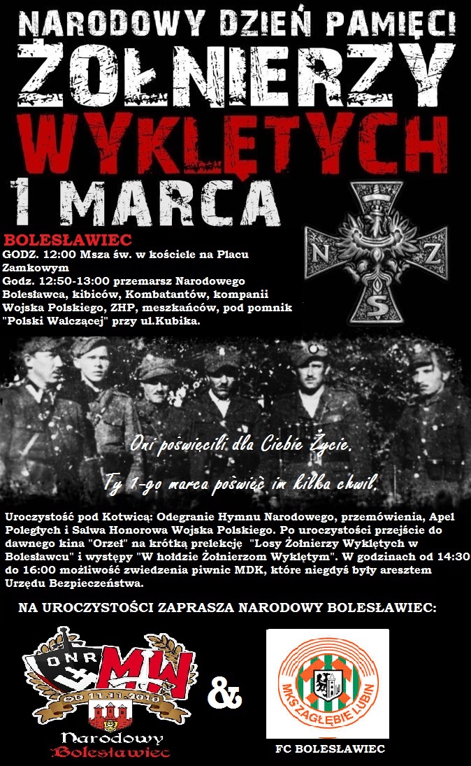 Kibice Zagłębia Lubin w Bolesławcu zapraszają wszystkich sympatyków Zagłębia na obchody Dnia Żołnierzy Wyklętych, które odbędą się 1-go marca. W marszu wraz z nami pójdą kibice Zawiszy Bydgoszcz z Inowrocławia, z którymi zawiązała się i umocniła sztama. Po obchodach zapraszamy na krótki 25-cio minutowy film na temat Żołnierzy Wyklętych z terenów Bolesławca oraz wysłuchanie pieśni patriotycznych śpiewanych przez dzieci z tutejszego hufca ZHP. Możliwe jest także zwiedzenie piwnic dawnego Urzędu Bezpieczeństwa, gdzie przetrzymywano i katowano niegdyś więźniów politycznych, żołnierzy. Serdecznie zapraszamy do Bolesławca na uczczenie pamięci ludzi walczących za Wolną Polskę.