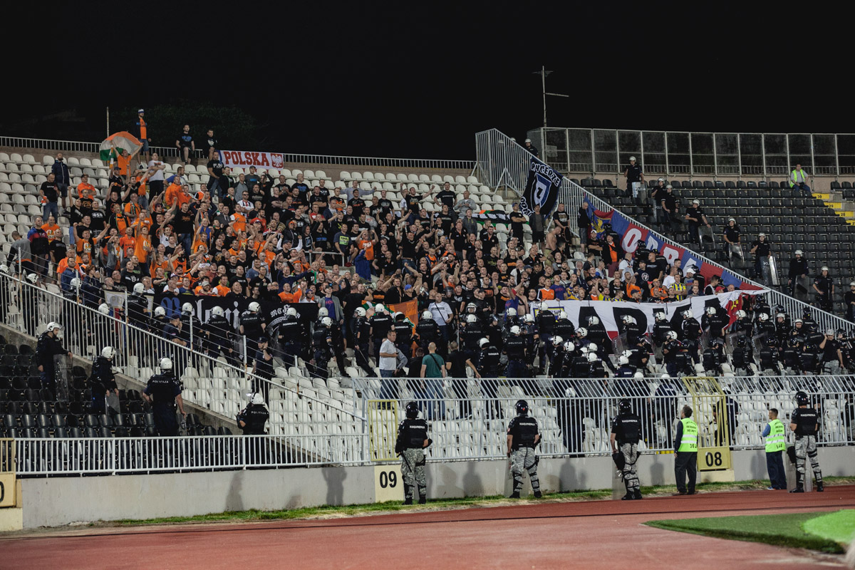 Wkurwienie narastało wyjątkowo, ale w końcu nadeszła godzina 18:30 i dostaliśmy zgodę na wjazd na terytorium Serbii. W tym momencie już tylko każdy liczył na jak najszybsze dotarcie pod bramy stadionu Partizana. Początek trasy napawał optymizmem, kolejne kilometry mijały w dość przyzwoitym tempie. Niestety, w pewnym momencie konwój zwolnił i nastąpiło przekazanie nas w ręce żandarmerii, która za punkt honoru obrała sobie wkurwienie nas do granic możliwości i transportowanie z zabójczą prędkością 60km/h. Kilka prób wyprzedzenia "pilota" kończy się na zatrzymaniu całej grupy i nerwową wymianą zdań z prowodyrami całego zamieszania. Po chwili ruszamy dalej. W tym momencie każdemu z nas już zależało tylko na tym, żeby zdążyć chociaż na chwilę meczu. Dość sprawny przejazd przez miasto i wreszcie meldujemy się pod bramami. Tu niestety po raz kolejny nie popisali się miejscowi stróże prawa i każdy autokar osobno przechodził kontrolę na sektor, która mimo wszystko szła dość sprawnie. Porządkowi nie byliby sobą, gdyby znów na coś bystrego nie wpadli. Wszelkie potencjalnie niebezpieczne element typu zapalniczki czy monety dostały zakaz stadionowy. Pierwsza grupa eskapady melduje się na sektorze około 60 minuty meczu, ale nie wszyscy mieli tyle szczęścia i ostatnie osoby wchodzą w okolicach 80 minuty spotkania.