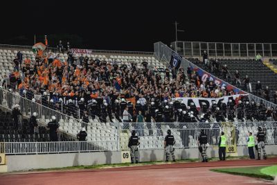 Nasz doping rozpoczynamy w momencie, gdy pierwsza większa grupa weszła na obiekt. Trzeba przyznać, że wyjątkowo kozacko prezentowaliśmy się wokalnie tego dnia. Dawno takiej korby nie było na naszym wyjeździe, każdy dawał absolutnie maksa z siebie. Mieliśmy ze sobą kilka flag, jednak tradycyjnie główny aktor wieczoru w postaci miejscowej policji, postanowił zablokować nam dostęp do ogrodzenia i tylko nieliczne z nich zostały wyeksponowane. Pozostałe były albo trzymane w rękach, albo rozwieszone na siedzeniach. W sumie wszystkich razem zgromadzonych na naszym sektorze było 360 osób, w tym konkretne wsparcie od każdej z naszych zgód: Arka Gdynia 17 osób, Falubaz 20 osób, Odra Opole 15 osób, Zawisza Bydgoszcz 20 osób i Polonia Bytom w liczbie 38 osób. Wszystkim dziękujemy za wsparcie na tym wyjeździe! Jeszcze słowo o naszej chojnowskiej ekipie - wybrało się nas do Belgradu 11 osób. Ach no tak, jeszcze coś o kibicach Partizana. Dopingu praktycznie u nas nie słychać. Z relacji osób, które wybrały inny środek transportu wynika, że potwierdzili to, z czego słyną - głośny, równy i wyjątkowo melodyjny śpiew. Do tego dość konkretne oflagowanie swojego sektora.