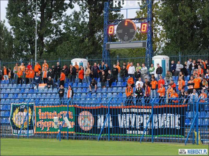 Ostatecznie transportem kołowym w kierunku Górnego Śląska wyruszył autokar, busy i dość spora liczba samochodów. Wszystko to złożyło się na liczbę 200 osób na sektorze, w tym załoga [b]17[/b] fanatycznych chojnowian. Liczby tej z pewnością nie musimy się wstydzić, przynajmniej poniżej pewnego poziomu nie schodzimy... Na płocie wylądowała dość spora liczba flag: Na wyprawie, fanatyczni chojnowianie, FCP (wyjazdówka FC Polkowice), SZL, OCB i flaga Bolesławca. Od samego początku zaznaczamy obecność okrzykami i tak już pozostaje do samego końca spotkania. Jednorazowa próba zabawy spełzła na niczym, więc już później darowaliśmy sobie tego typu wyskoki. Miejscowi również nie zachwycili, prowadząc raczej przeciętny doping, no przynajmniej tak to wyglądało z naszej perspektywy. O walorach akustycznych chorzowskiego obiektu nie ma nawet sensu się wypowiadać, miało to naturalnie swoje przełożenie na doping zarówno z naszej strony jak i fanów Ruchu.